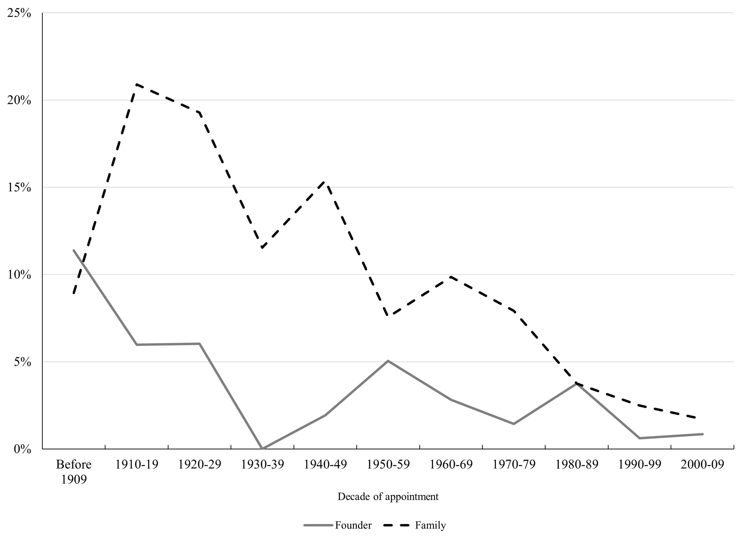 Figure 1: Percentage of Britain’s largest companies that had CEOs who were family members or founders (pre-1909 to 2009)