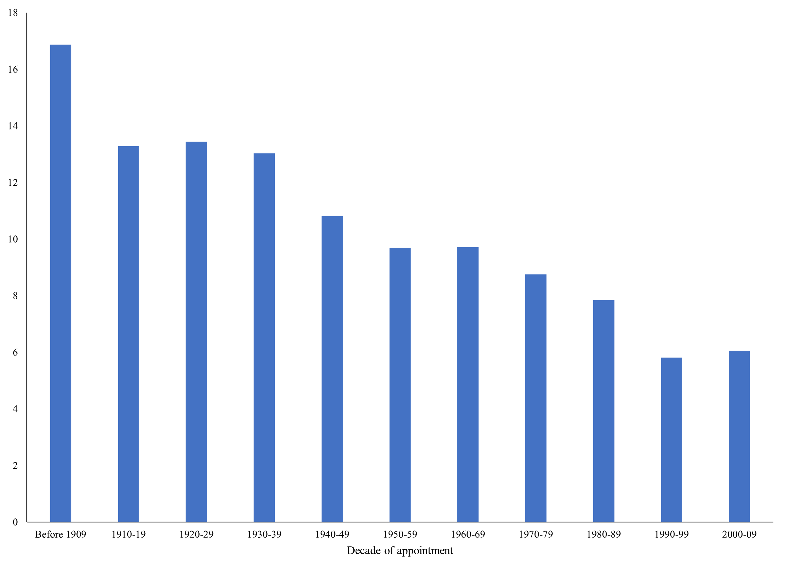 Figure 2: The Average tenure (years) of CEOs (pre-1909 to 2009).